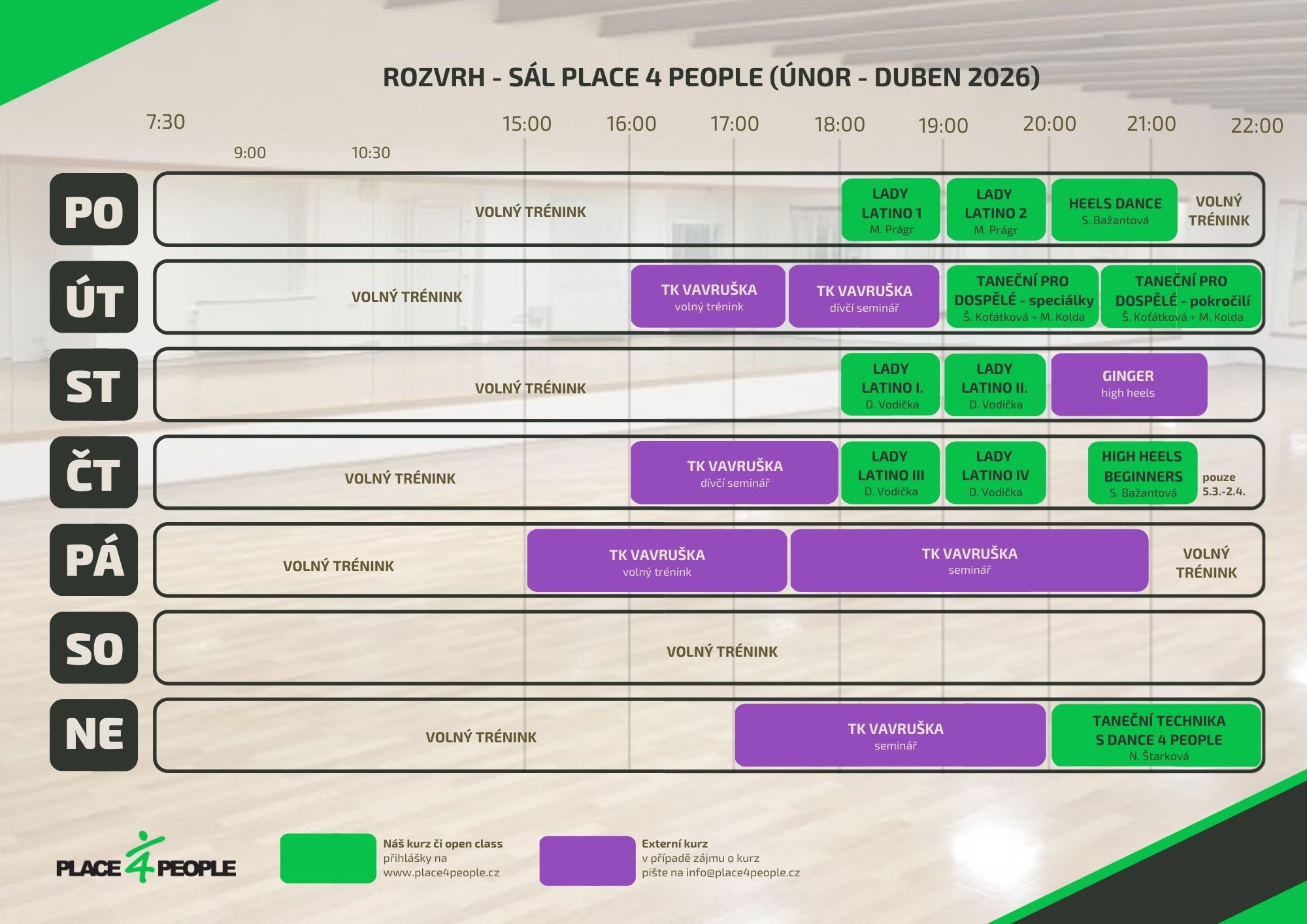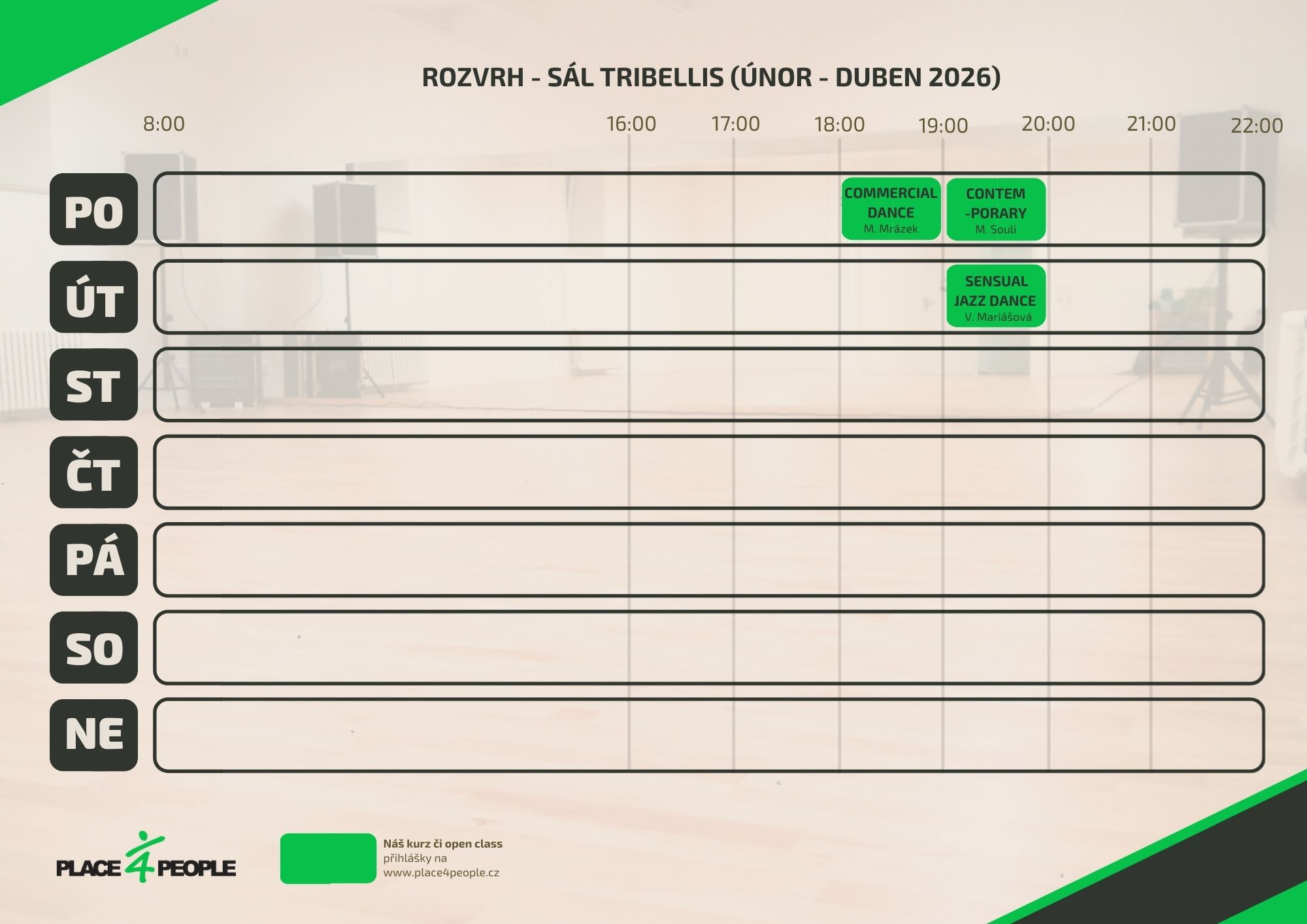 Volné tréninky v Place 4 People jsou možné každý den od 8:00. Pro rezervaci sálu nám napište prostřednictvím kontaktního formuláře níže nebo na email info@place4people.cz.